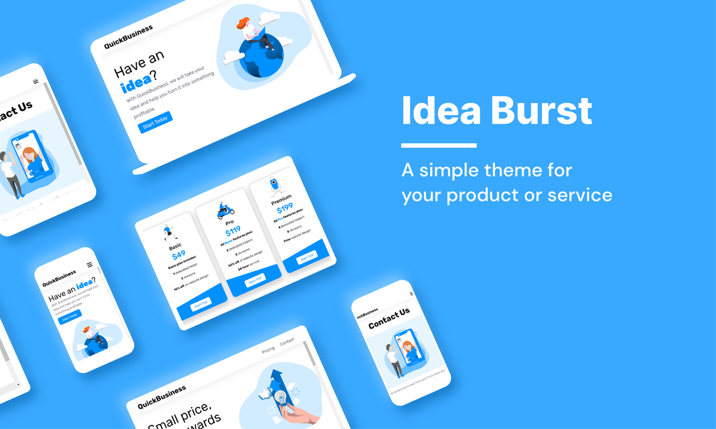 Idea Burst shows off your idea with great illustrations and clean design. Don't like blue and prefer a different accent? Edit the SASS variables in the given stylesheets to customize it to your liking.